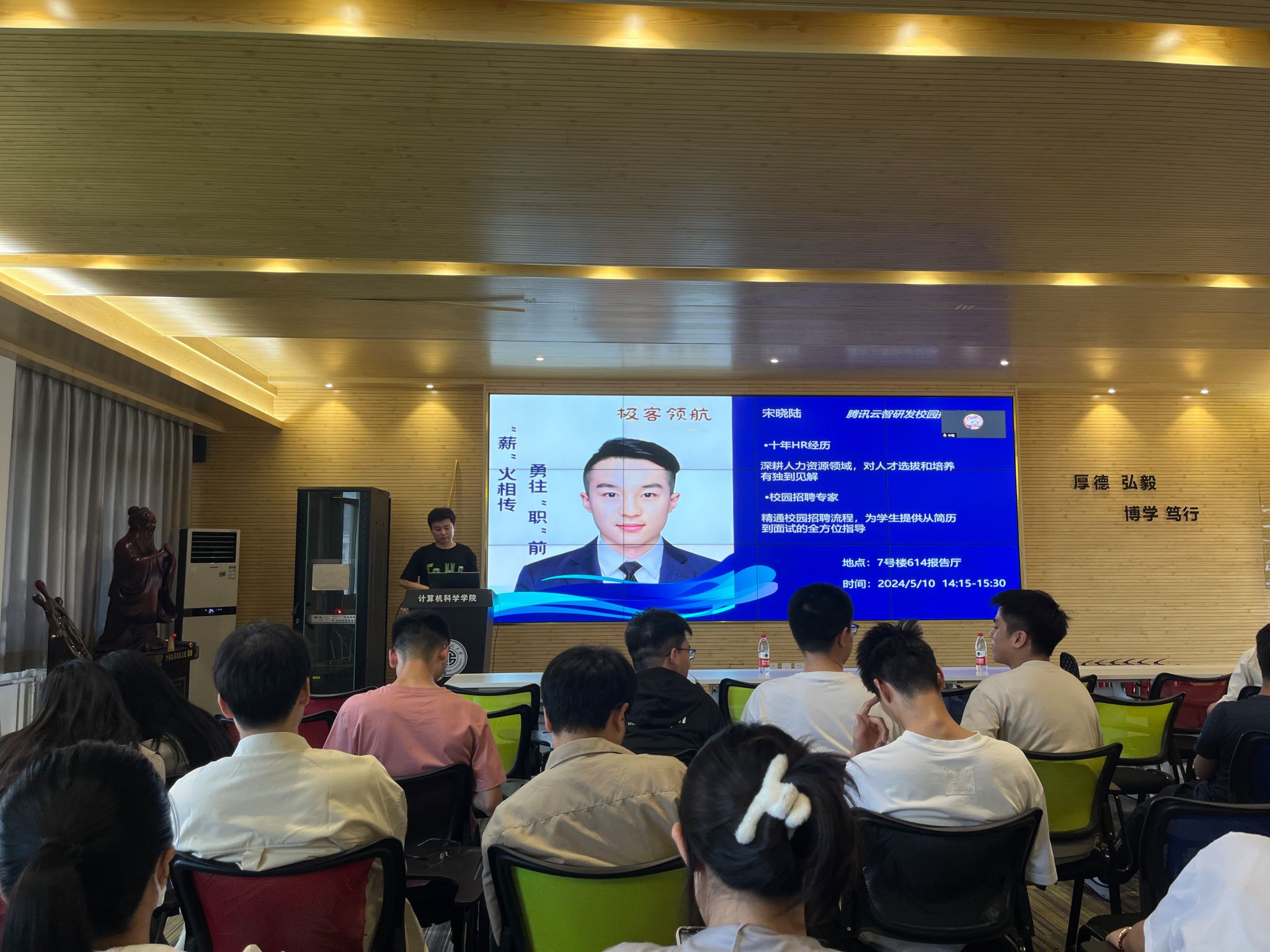 为了提升学生未来职场竞争力,特别是针对即将步入职场或寻求职业发展的同学,2024年5月10日,必赢766net手机版在临潼校区笃行楼614学术报告厅举办了《“极客”系列活动之“‘薪’火相传 勇往‘职’前》主题活动,活动邀请了腾讯云智校园招聘经理宋晓陆,同学们与HR面对面,探讨面试经验和专业的简历制作技巧。研究生辅导员薛绍凡及一百余名研究生参加了报告会。