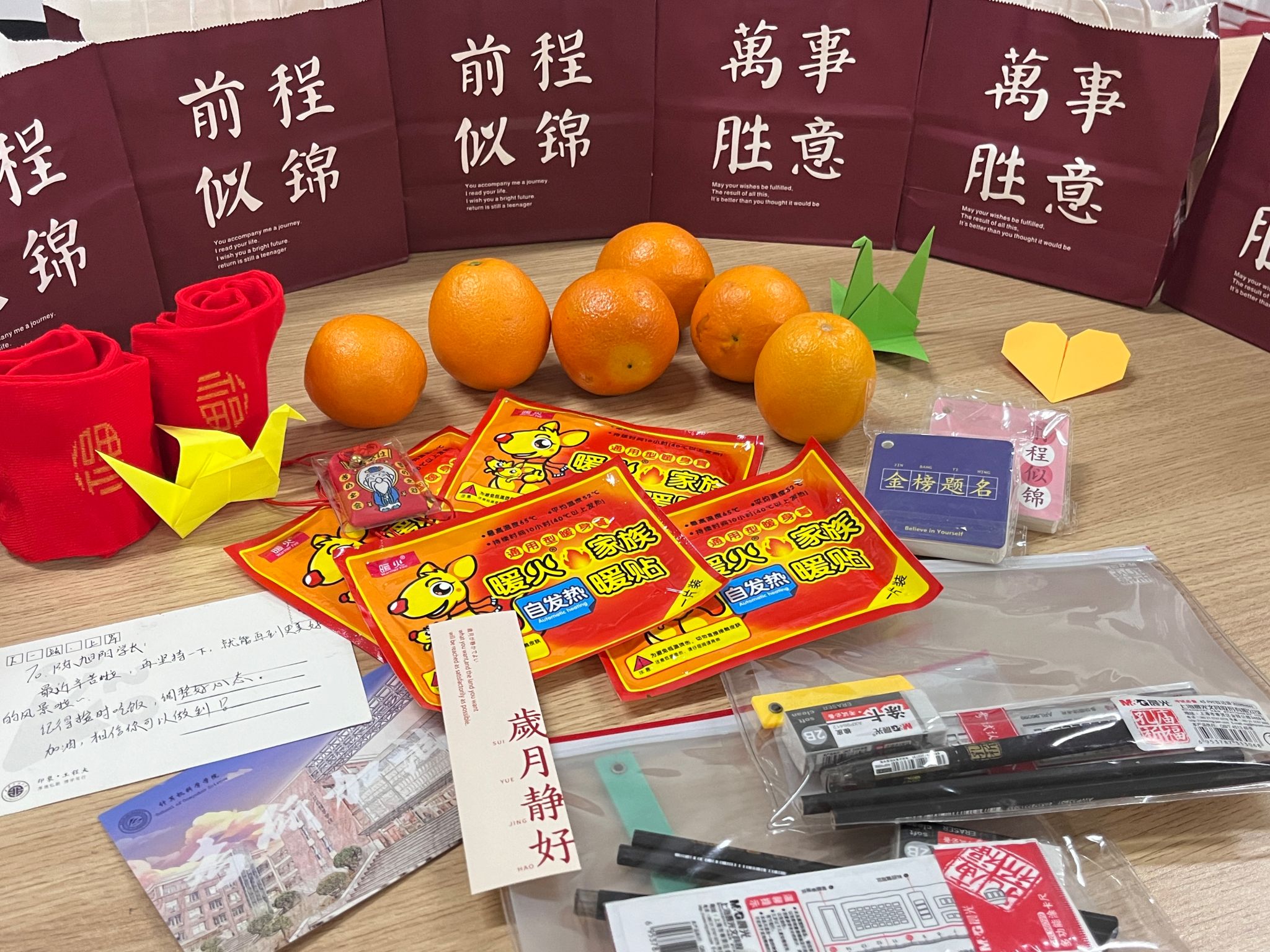 经过前期精心摸排和准备,共确定了164名考研学生。学院精心准备了“金榜题名”文具套盒、脐橙、福袋、祝福卡片、暖贴等小礼品,希望在冬日里能为考研学生送去温暖和信心。